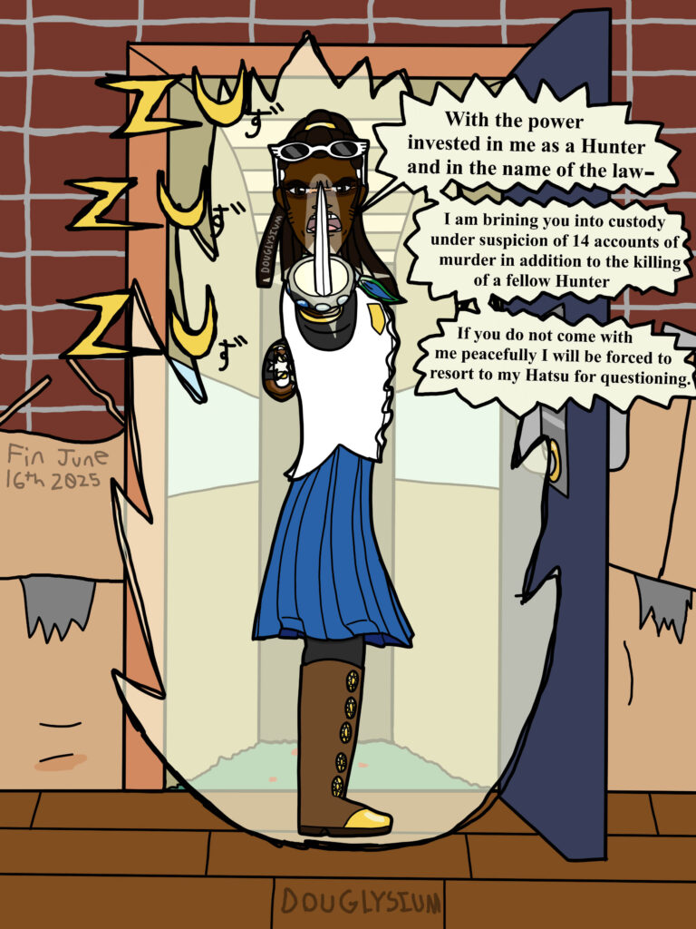 My OC, a tall Black woman with wide shoulders and dreads done in a ponytail, pointing a lit flashlight with a blade emerging out of it towards the camera and saying “With the power invested in me as a Hunter and in the name of the law- I am bringing you into custody under the suspicion of 14 accounts of murder in addition to the killing of a fellow Hunter. If you do not come with me peacefully I will be forced to resort to my Hatsu [this should be Nen ability when it comes to terminology] for questioning.” The speech bubble this text is in has a yellow tint. Lily is in a room with a brick wall, wooden floor, and boxes. Behind her is a hallway with windows and a carpeted floor. Lily’s aura is tinged yellow and flaring up in response to Ren in addition to her Nen ability being invoked, causing some of her clothes and dreads to flutter from the force created. A “zu zu zu” effect is displayed to show the use of Ren.