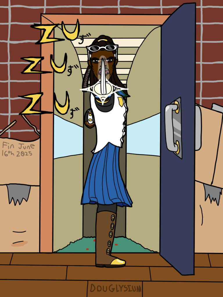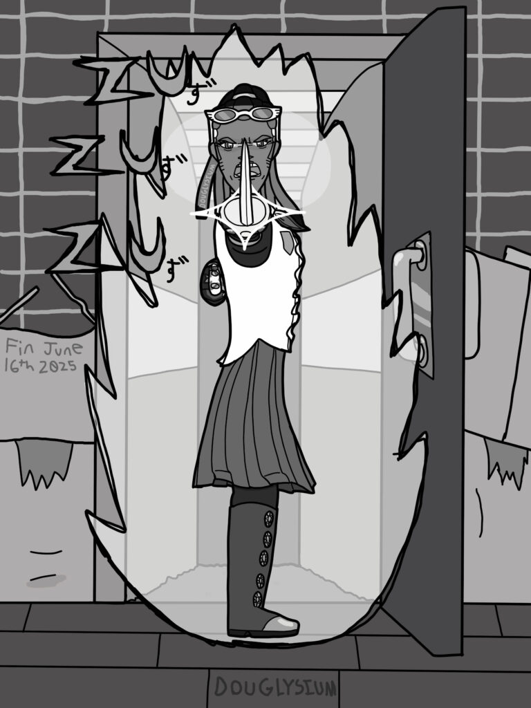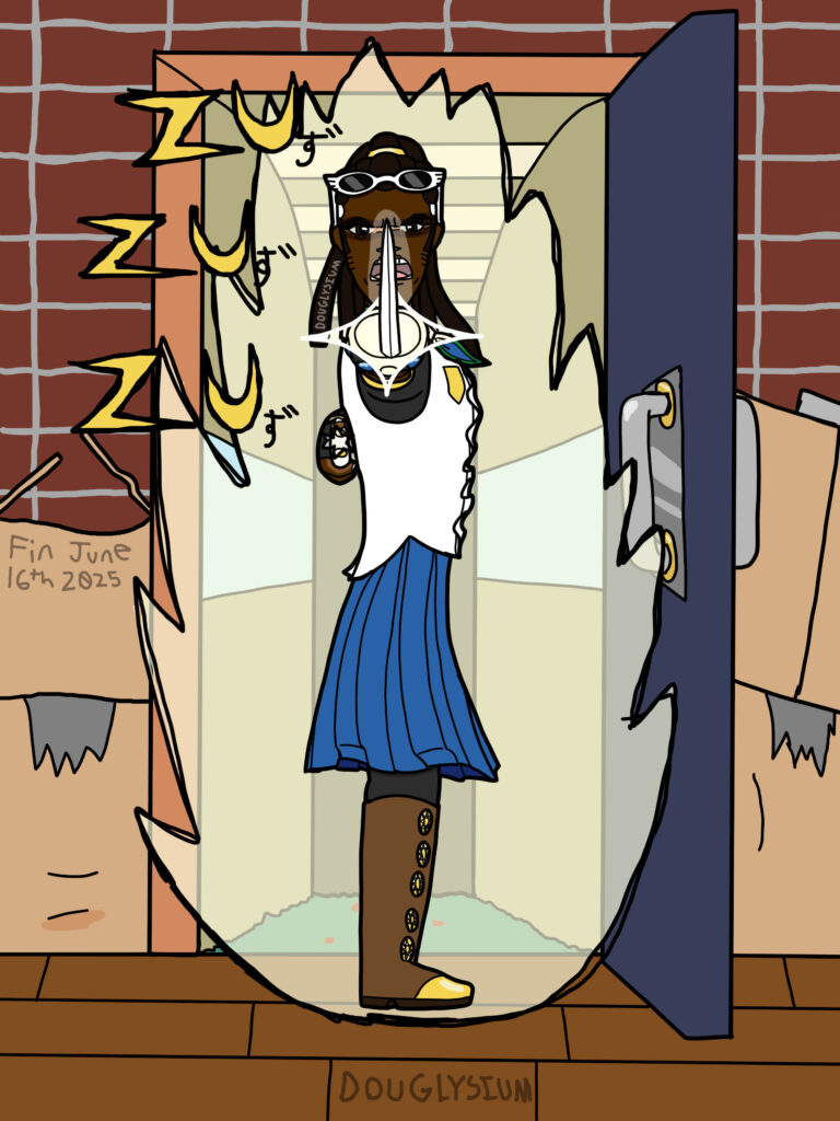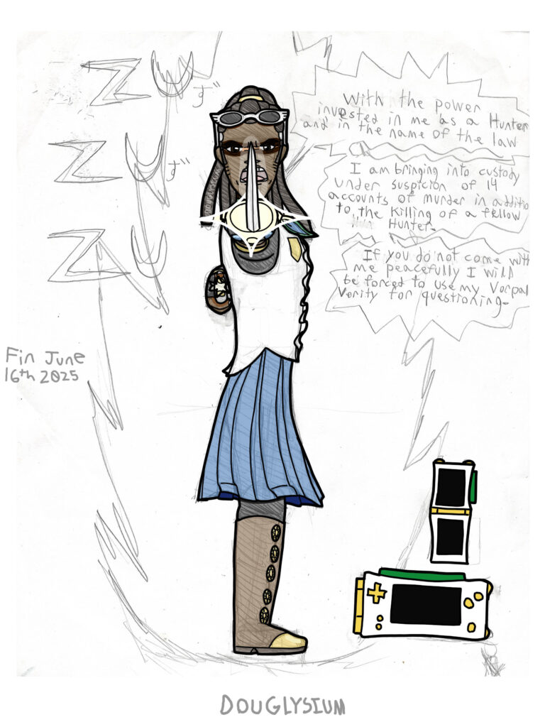 A version of the drawing in which Lily has had her opacity lowered and put over the pencil sketch of the drawing. There’s also a reference for her Nenyu (pronounced like Menu) device.