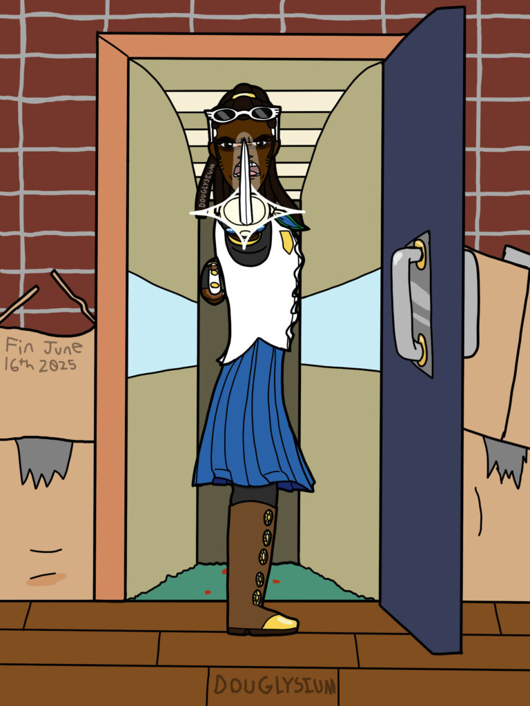 A version of the drawing that doesn’t have a flashlight beam pointing at the camera and covering Lily’s face. However, the flashlight is still emitting light near the base of the blade and the blade itself has a glowing appearance.