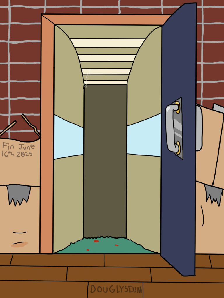 A black-and-white version of the drawing that doesn’t have a flashlight beam aiming at the camera and the blade isn’t glowing despite the presence of the gleaming light beneath it.