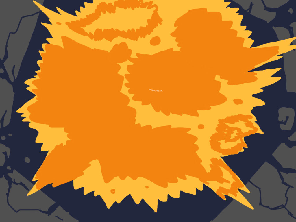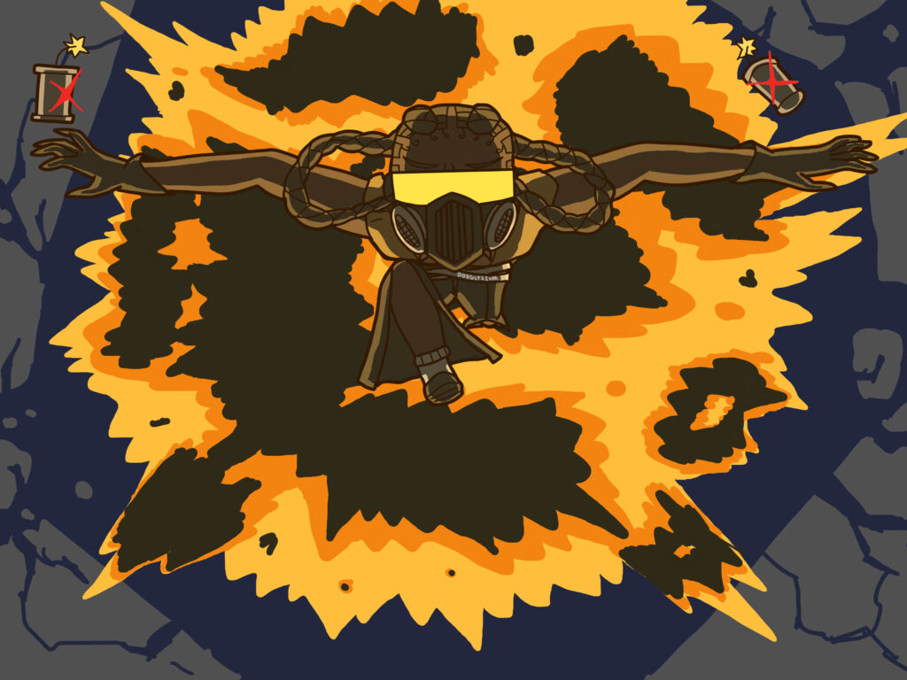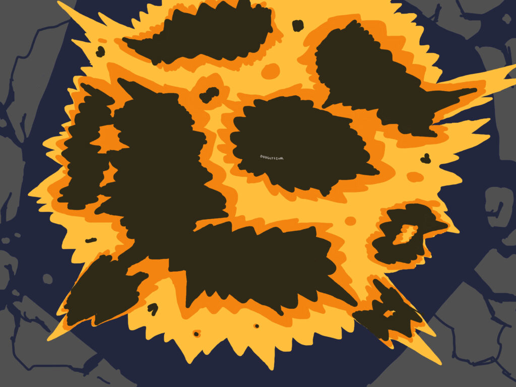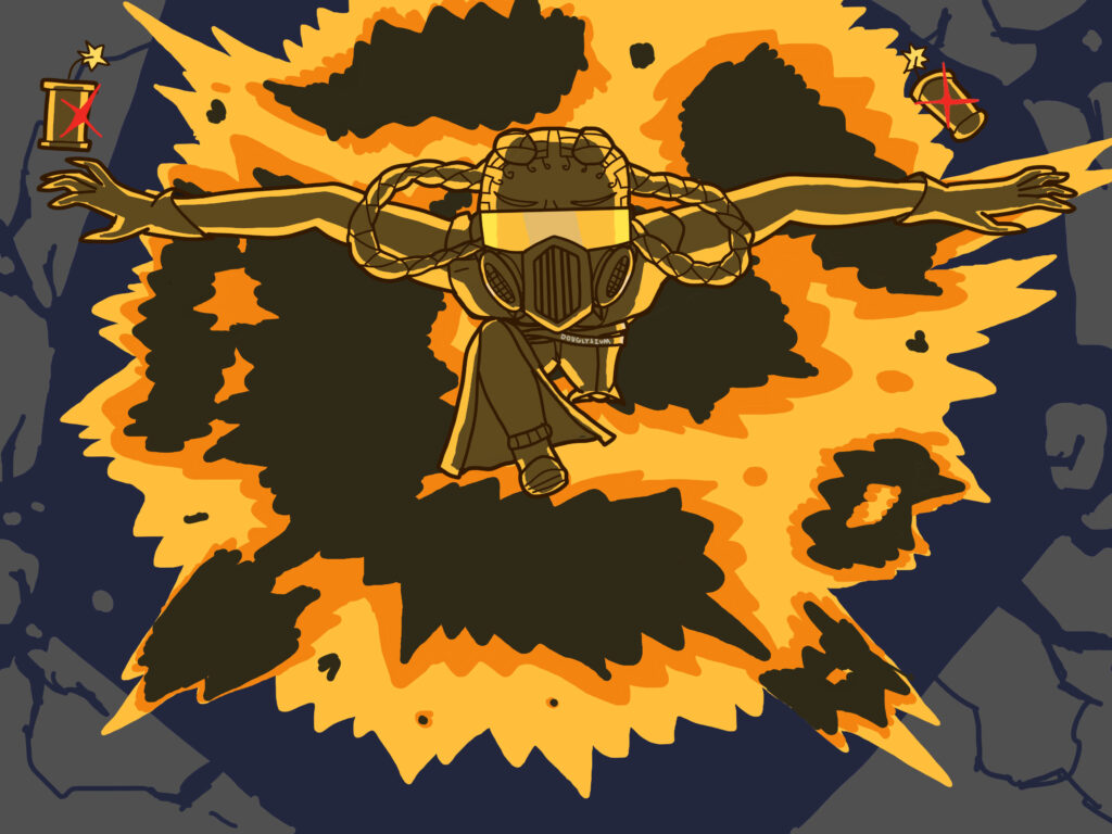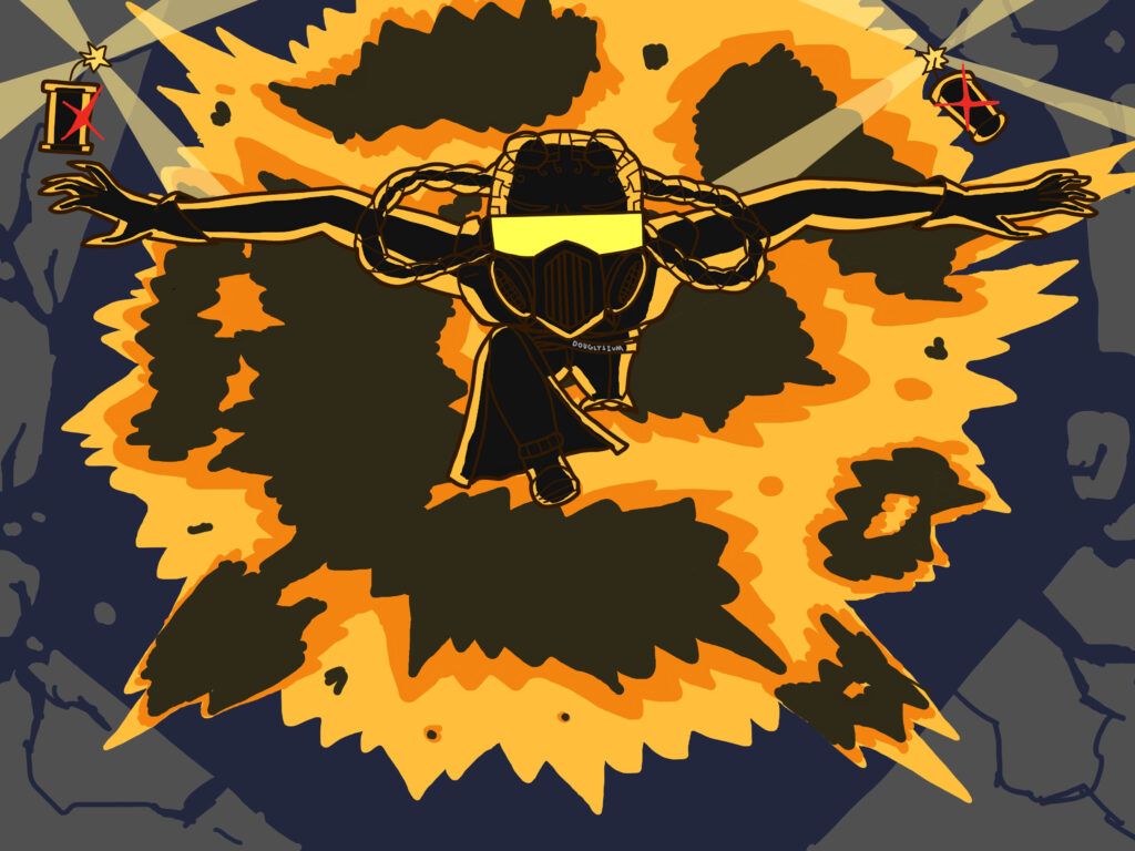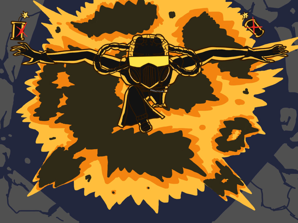 Same as the previous image except chaotic cracks spreading out from the cursed eye reveal the drawing’s original colors. The negative parts of the drawing have action lines but the normally colored parts do not.