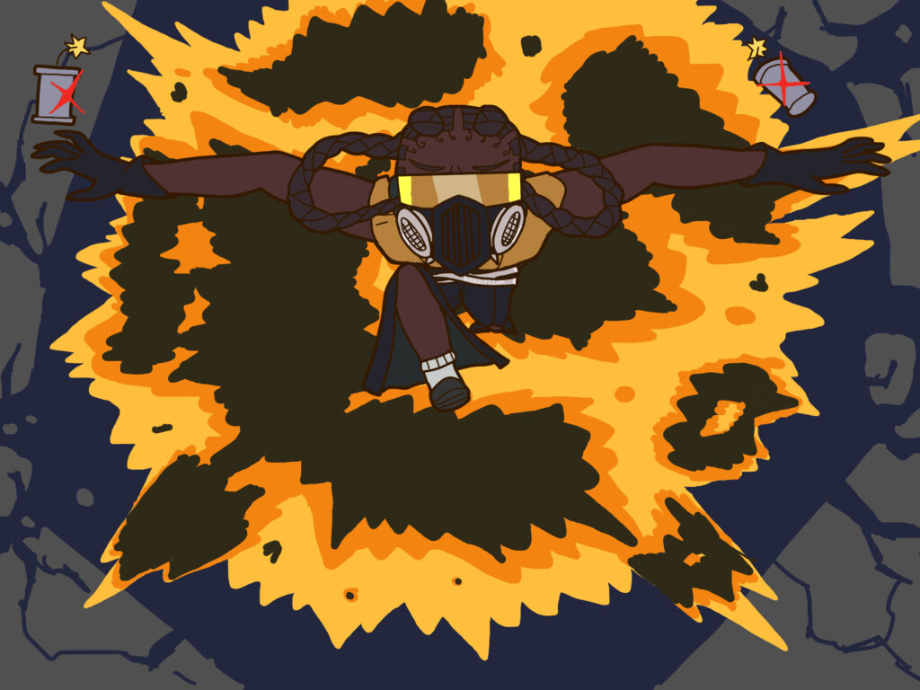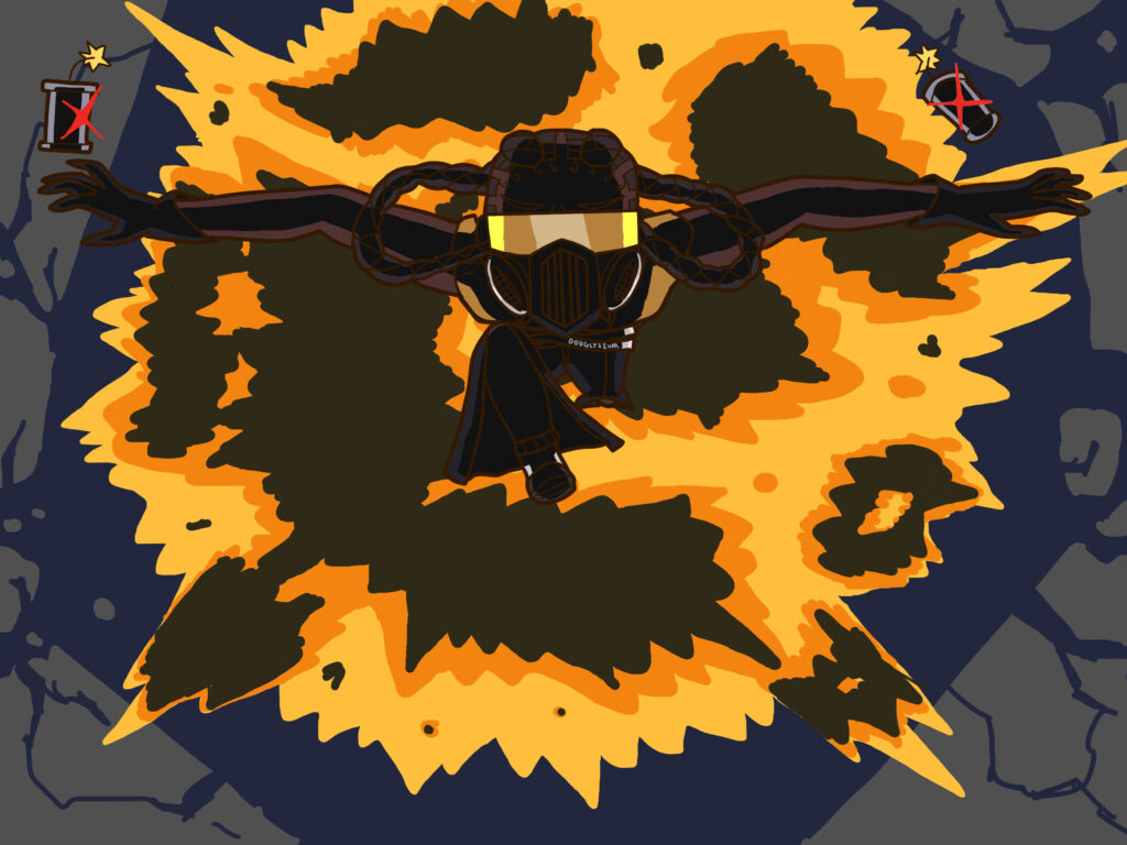 A digital drawing of Himarsaka’s OC Amari. She is a black trans woman staring at the camera and pushing her hair aside to reveal a cursed right eye with a black sclera, yellow iris, and vertically slit pupil emanating some sort of dark gray aura. Said cursed eye is accompanied by a scar and both it along with the area surrounding it are distorted as to appear bigger. Her left eye is more mundane, being brown in color with a mole / beauty mark under it, and she has a tooth gap. She is wearing a colored white shirt under a gray sweater and a choker / necklace that has a purple sparkling gem handing down the front. Her hair is in an afro.