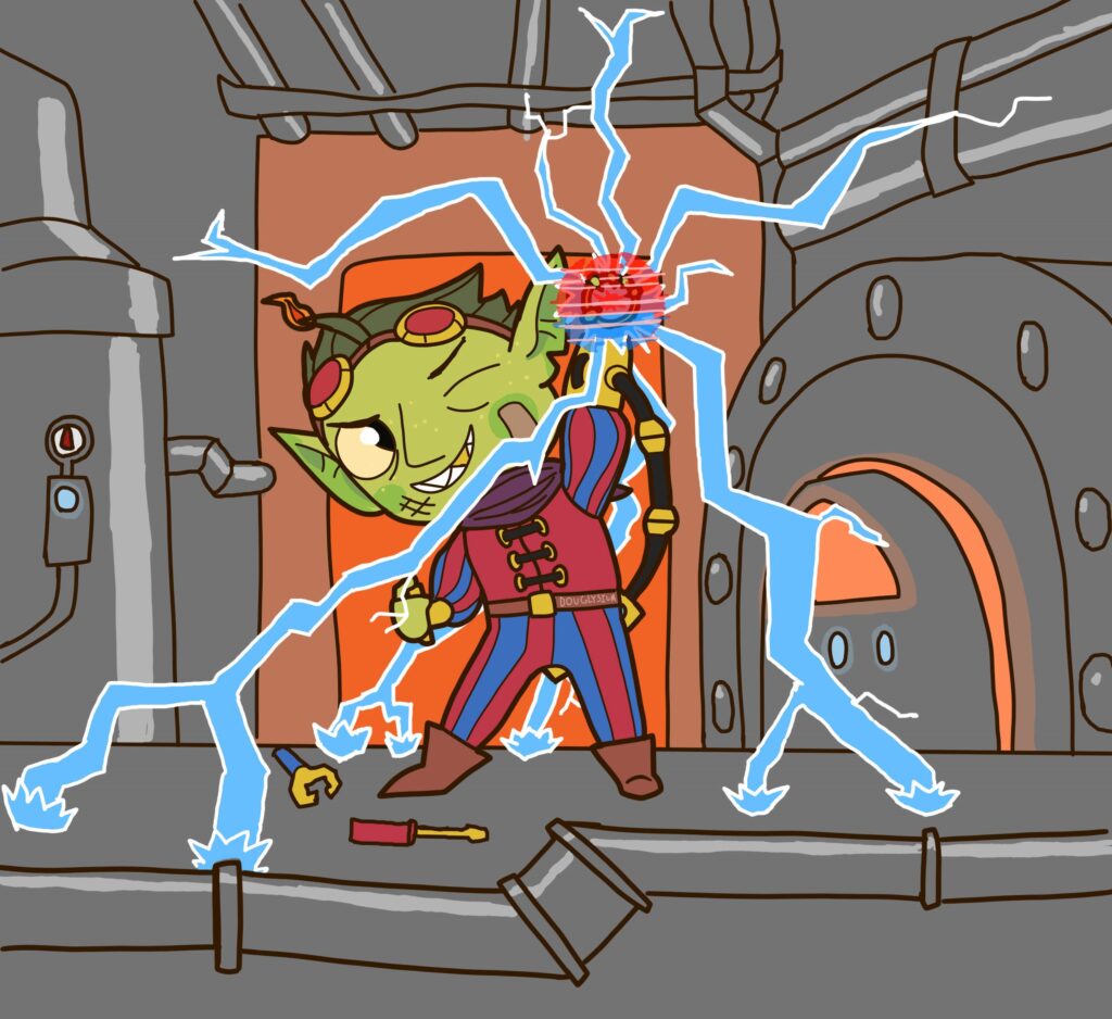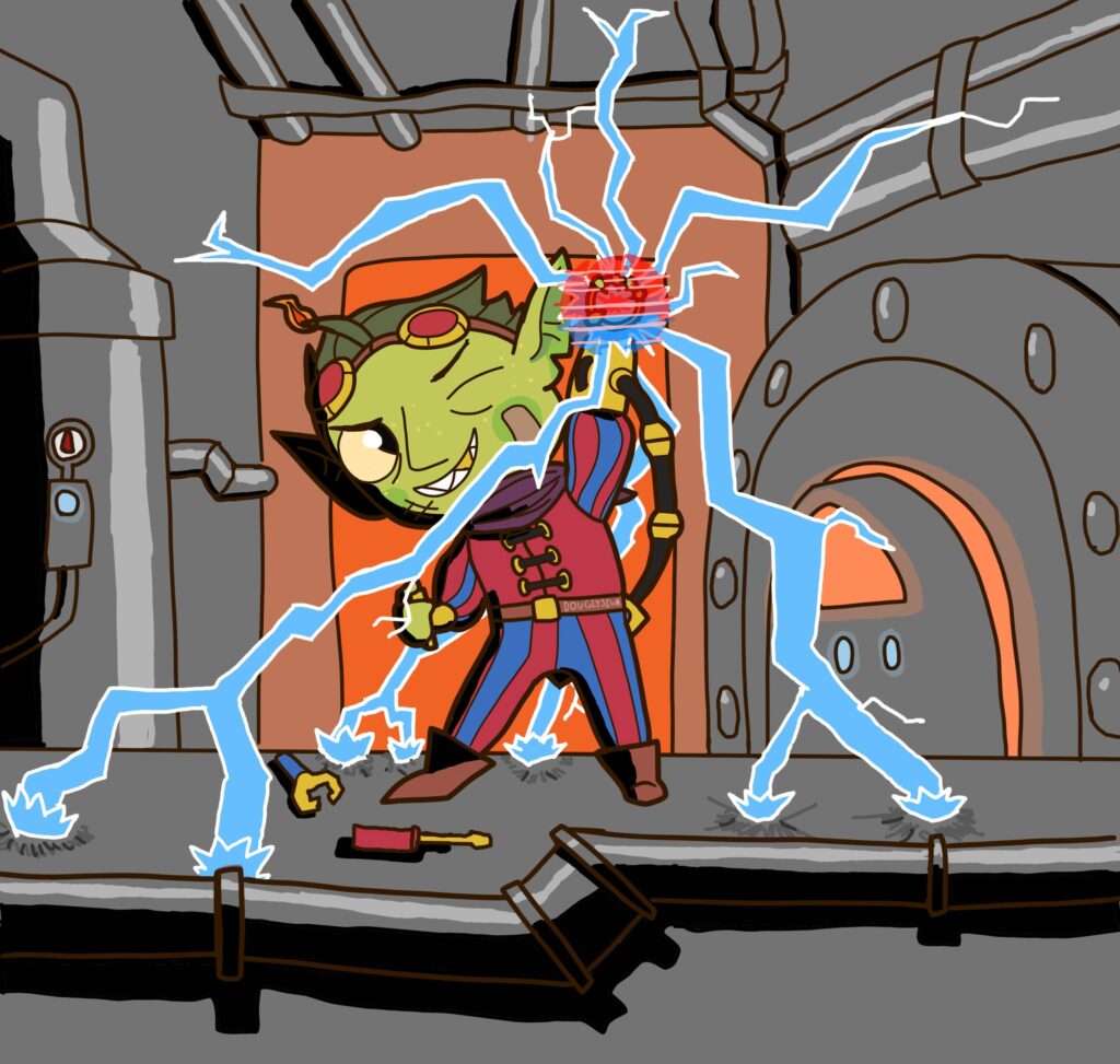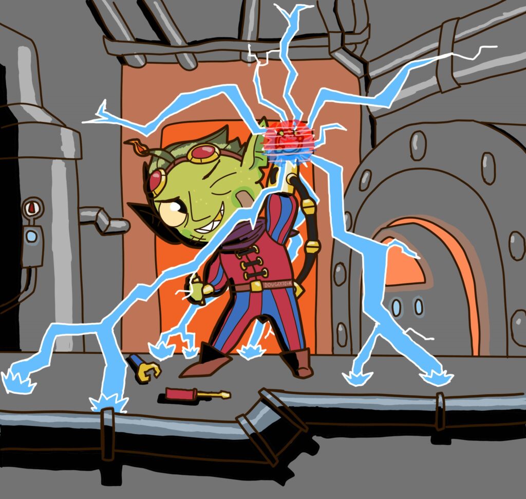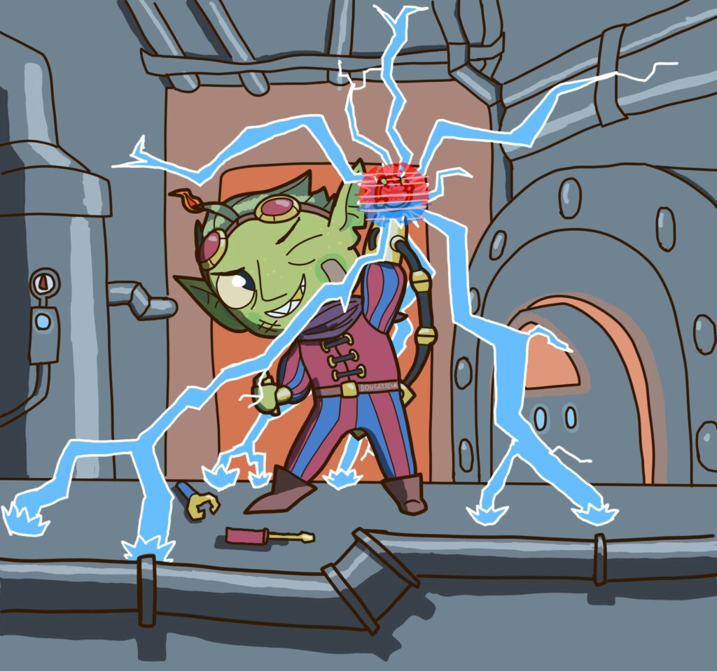 1: A chibi drawing of a green goblin with yellow freckles and darker green hair (said hair has a strand / ahoge that has been lit on fire by the experiment they are performing). Their left hand is raised up and holding a device. They are wearing goggles that have gold rims, red lenses, and brown straps. Their eyes are yellow with black pupils and they have a patch / bandaid on their left cheek with some sort of scratch or mark on their right cheek. They have their left eye closed from the brightness coming off of their experimental device and a smile that contains one golden tooth amongst their sharp toothed smile. In their left hand the device is releasing electricity in every direction while displaying a holographic symbol that resembles that of the Izzet guild. They are wearing an Izzet uniform that is primarily red and blue with striped sleeves alternating between the colors. Some sort of cord is connecting from a device behind their hip to the machine in their hand, and in their right hand is some sort of trigger being pressed. The environment is a metal room / hallway with a couple of tools on the floor and various pipes and machines spread throughout. There is a blue tint on Kid Izzet and the entire room due to the light coming off of their experiment. The shading is done in simple black.