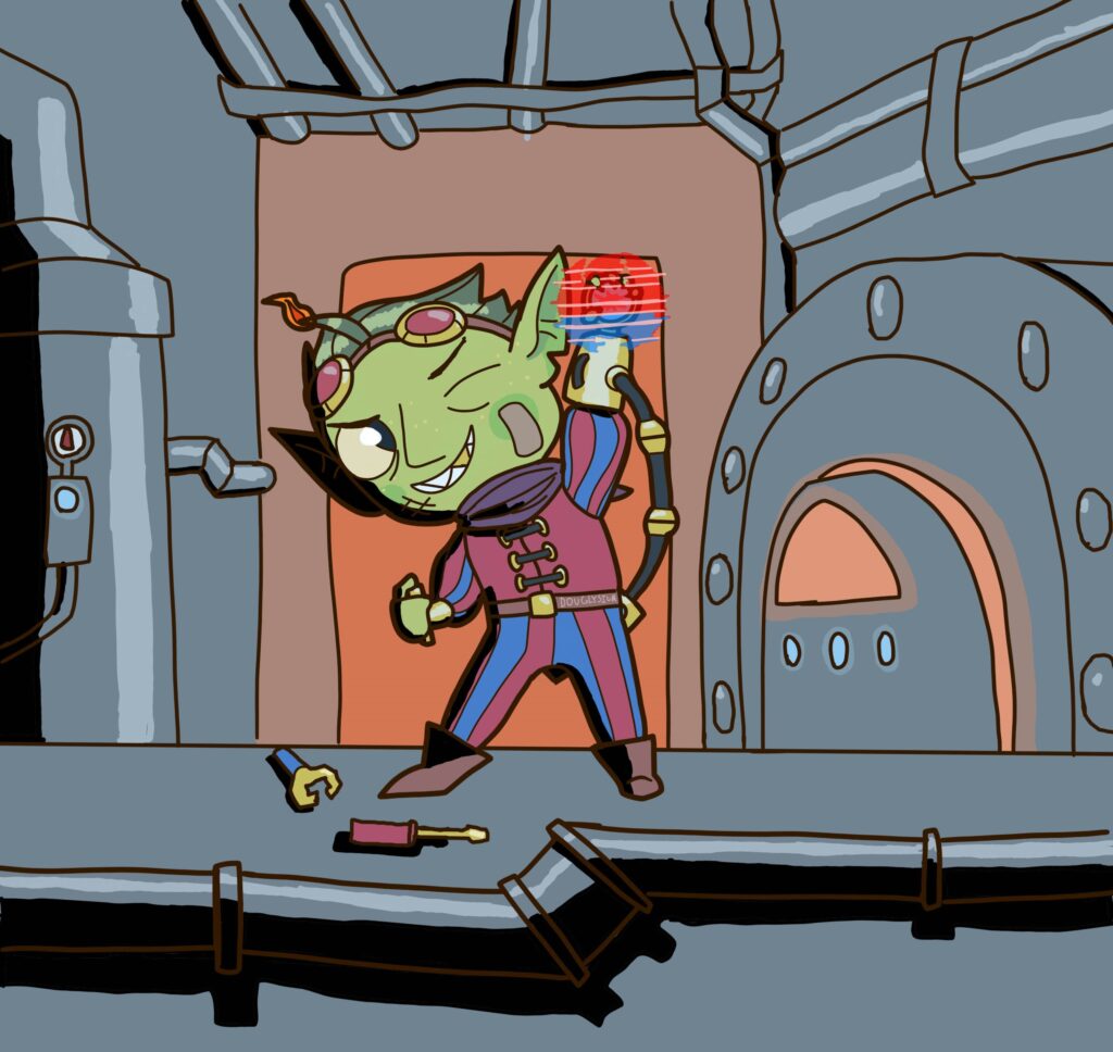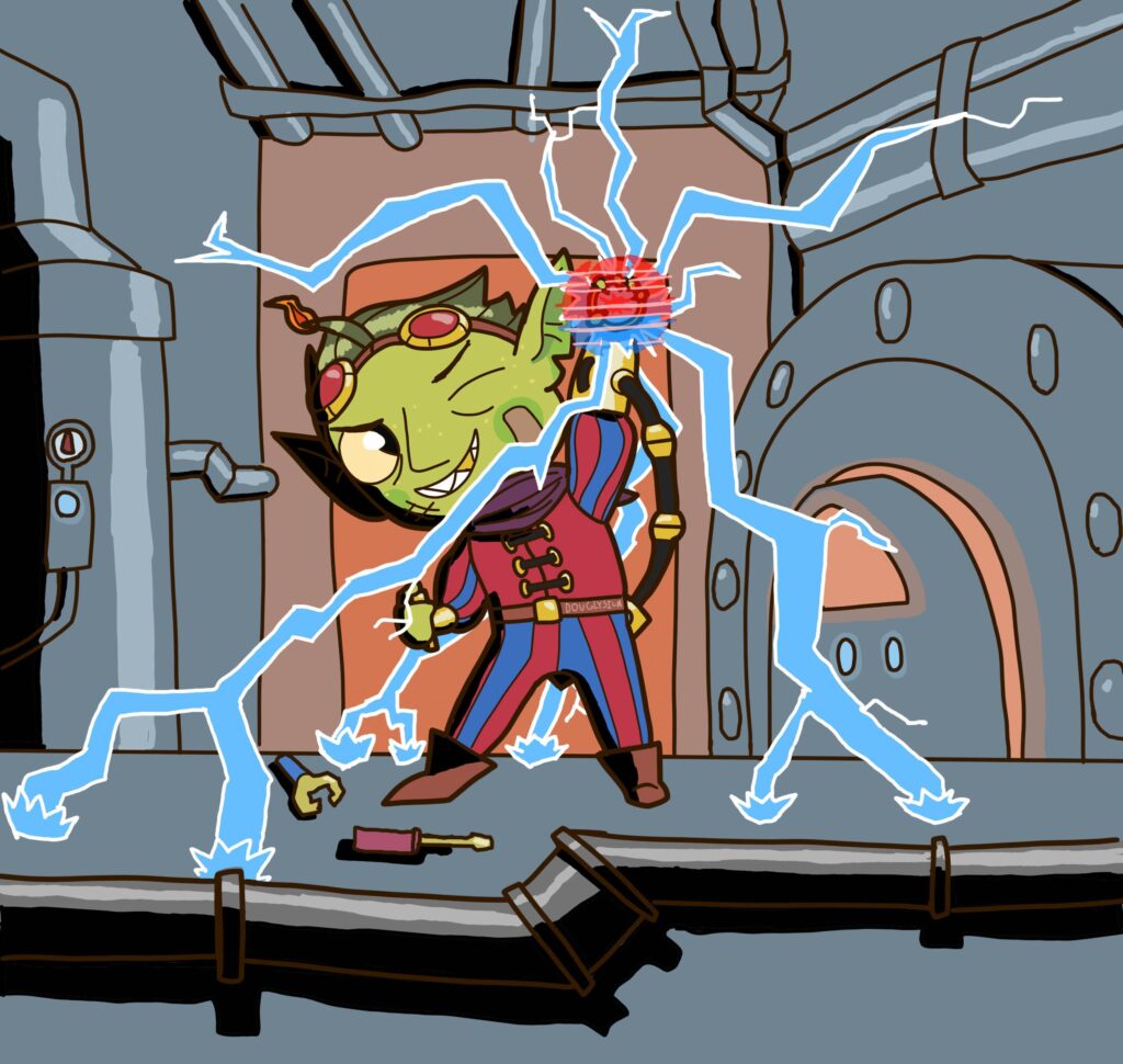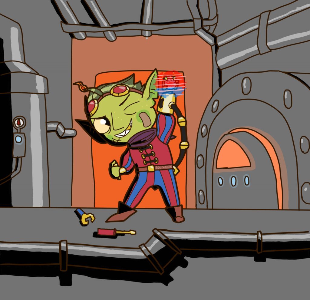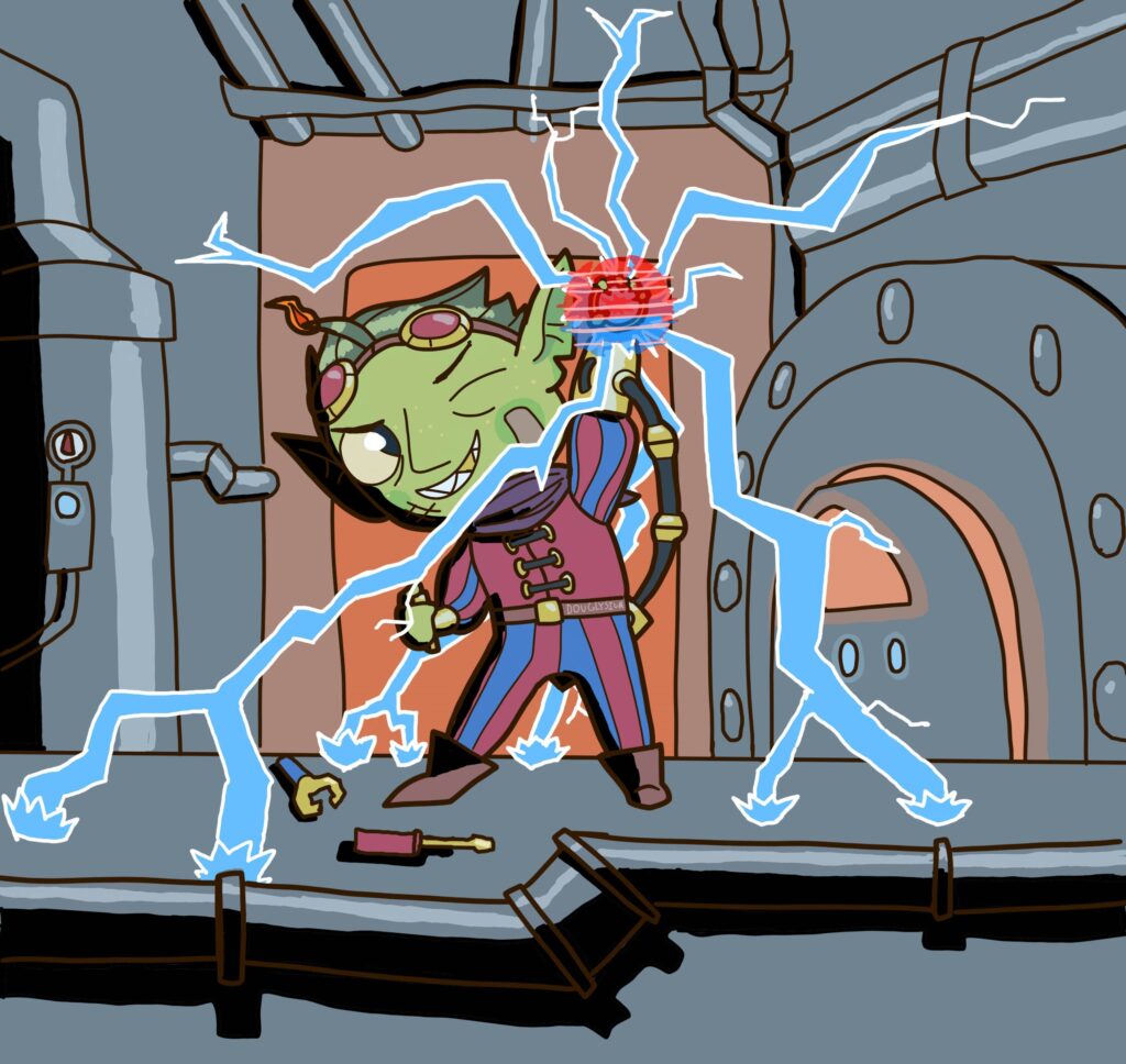 1: A chibi drawing of a green goblin with yellow freckles and darker green hair (said hair has a strand / ahoge that has been lit on fire by the experiment they are performing). Their left hand is raised up and holding a device. They are wearing goggles that have gold rims, red lenses, and brown straps. Their eyes are yellow with black pupils and they have a patch / bandaid on their left cheek with some sort of scratch or mark on their right cheek. They have their left eye closed from the brightness coming off of their experimental device and a smile that contains one golden tooth amongst their sharp toothed smile. In their left hand the device is releasing electricity in every direction while displaying a holographic symbol that resembles that of the Izzet guild. They are wearing an Izzet uniform that is primarily red and blue with striped sleeves alternating between the colors. Some sort of cord is connecting from a device behind their hip to the machine in their hand, and in their right hand is some sort of trigger being pressed. The environment is a metal room / hallway with a couple of tools on the floor and various pipes and machines spread throughout. There is a blue tint on Kid Izzet and the entire room due to the light coming off of their experiment. The shading is done in simple black.