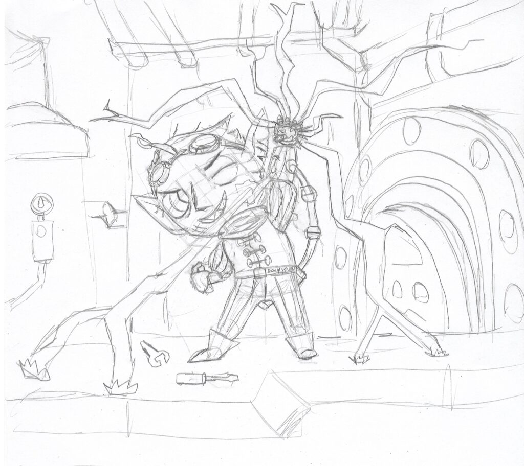 3: Same as the first drawing except Kid Izzet is not lit up by blue light. However, the background still has a shade of blue over it. Additionally, Kid Izzet has no shine effect on their hair or equipment.