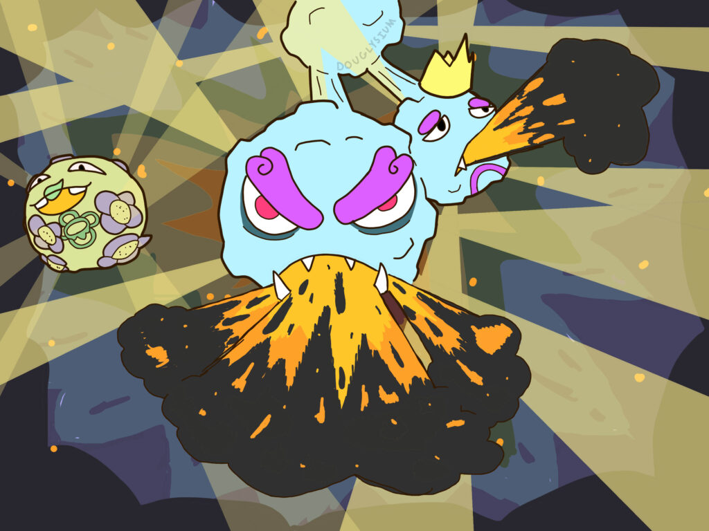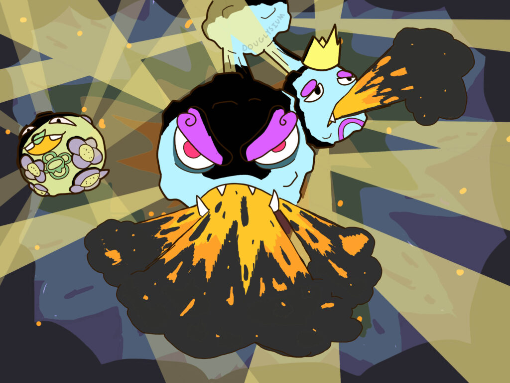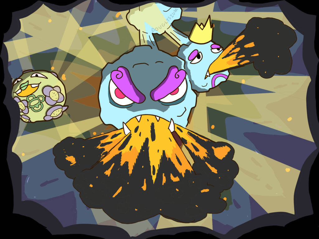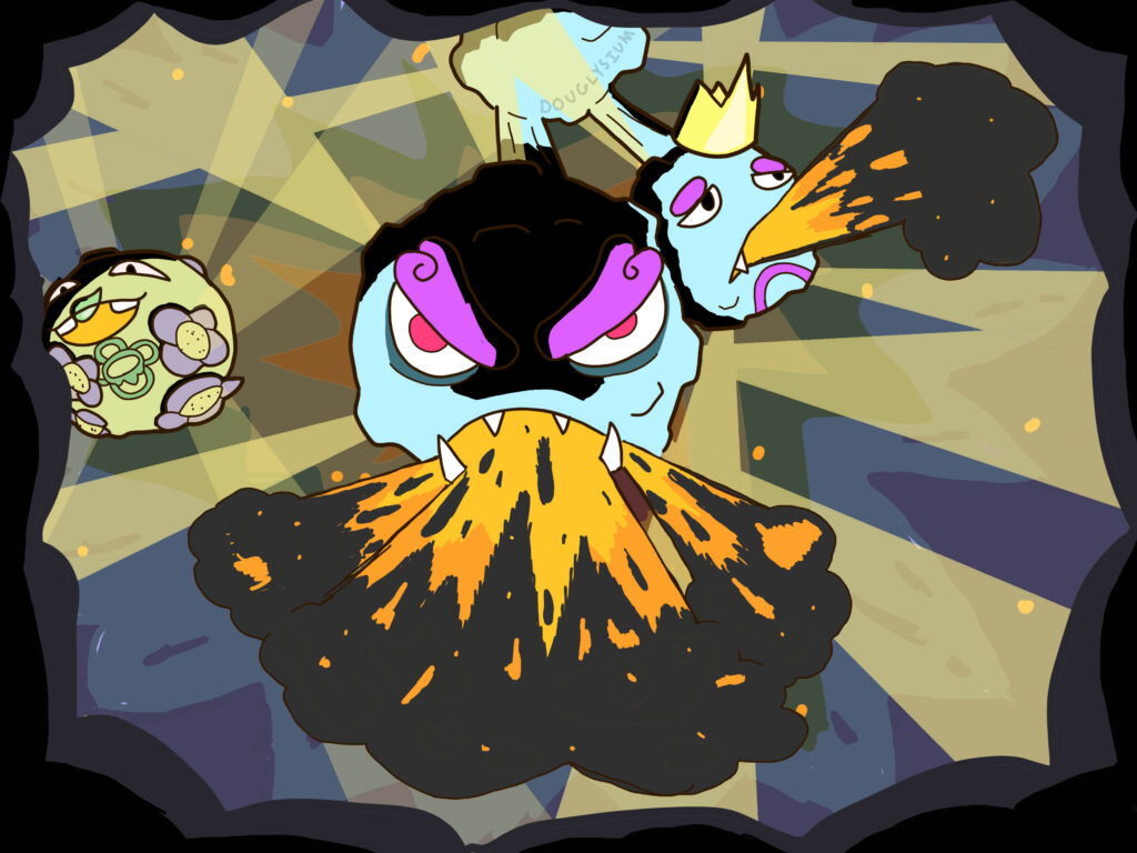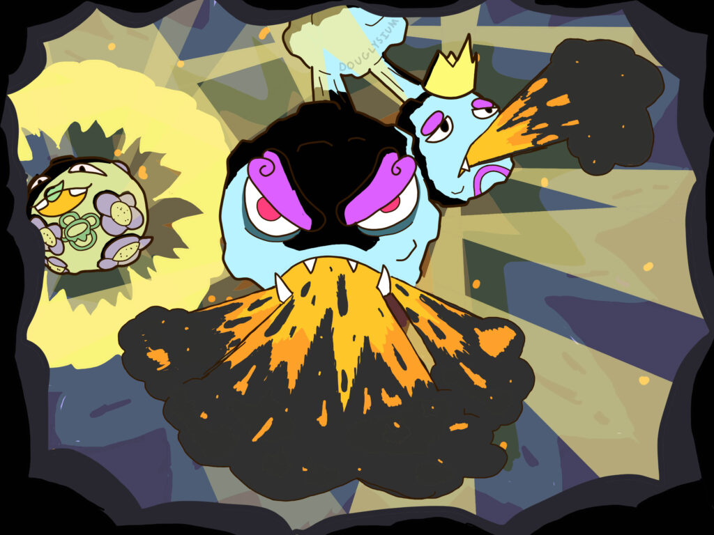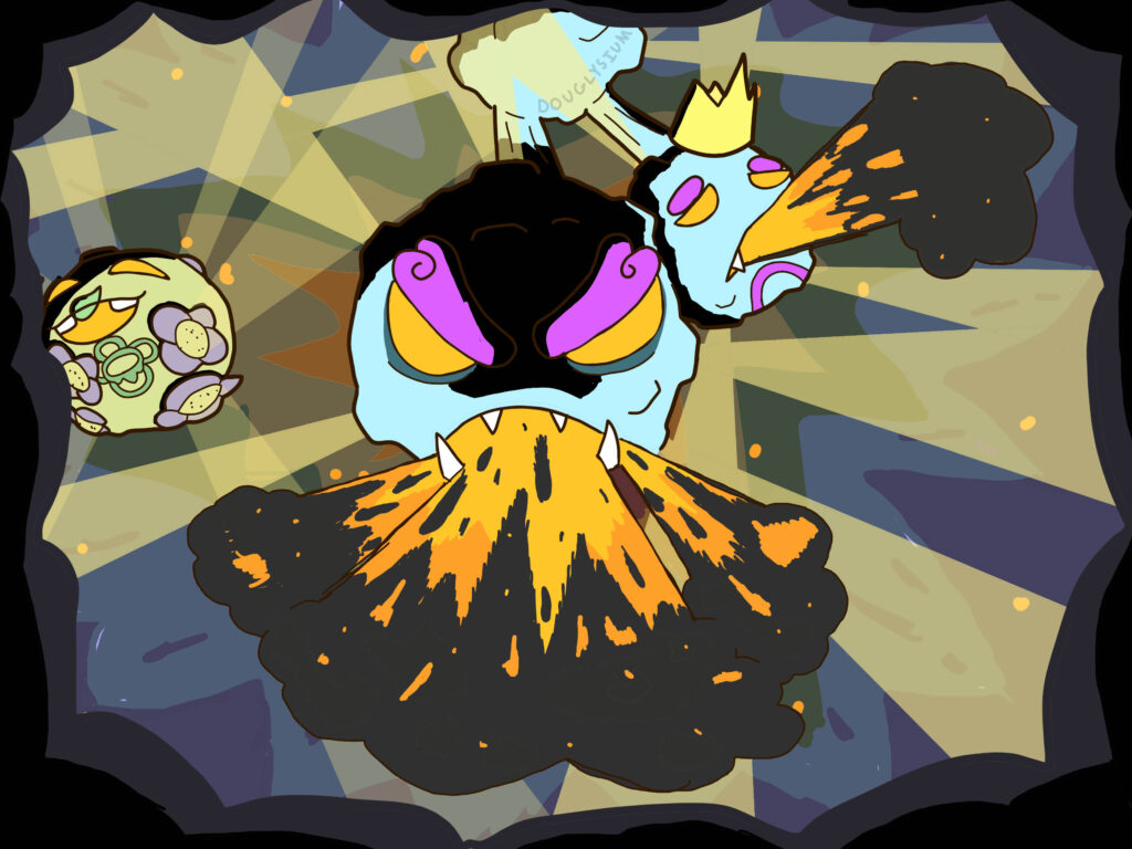 1: An Artfight attack I did on Petrel’s Pipebomb. Pipebomb is a shiny version of the Pokemon Weezing that is blue with vibrant pink / purple eyebrows and symbols of the same color on his chest. His smaller head wears a golden / yellow crown. In the drawing itself, Petrel is releasing a powerful fiery explosion from both his mouths as rays of light fire out from the pores on his body in every direction, while the bigger head holds an angry expression. In the background on the drawing’s left the design for my regional Koffing can be seen. It is a green Koffing that has flowers in the place of bumps, and it holds a much more jovial and happy expression as light pours out of the center of its flowers. A glob of snot hangs from its nose, and its mouth glows orange with energy. On its chest is a pattern that resembles a skill surrounded by petals. The foreground is lined with an extremely dark purple smoke, and the background has a rainbow collaboration exploding outwards that’s meant to invoke Pipebomb’s rainbow colored smoke. The shadows on Pipebomb and Koffing are rendered in a stark black.