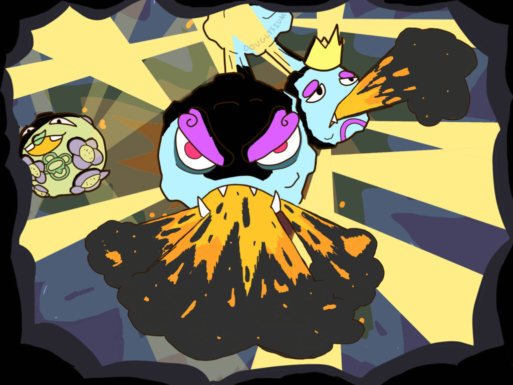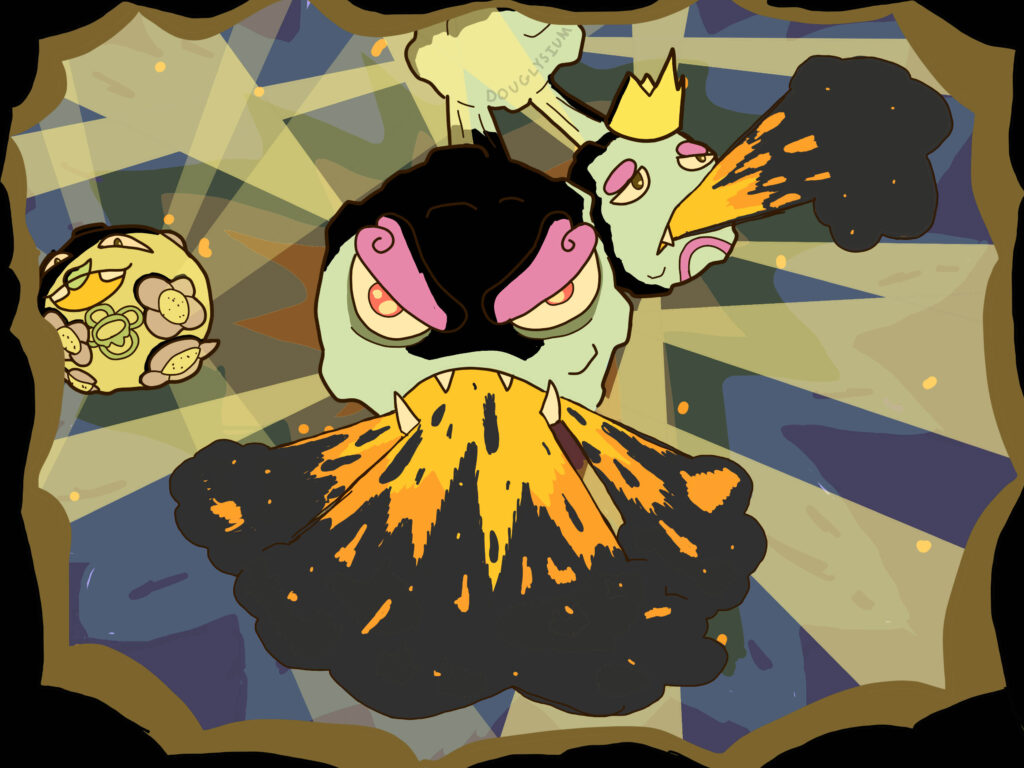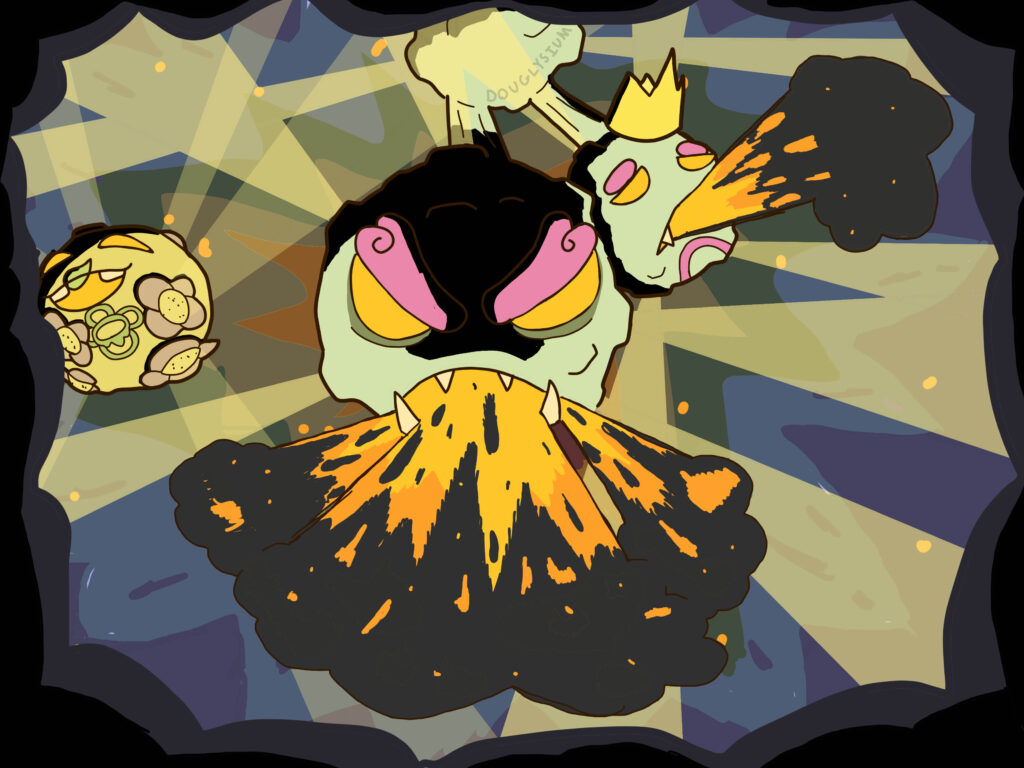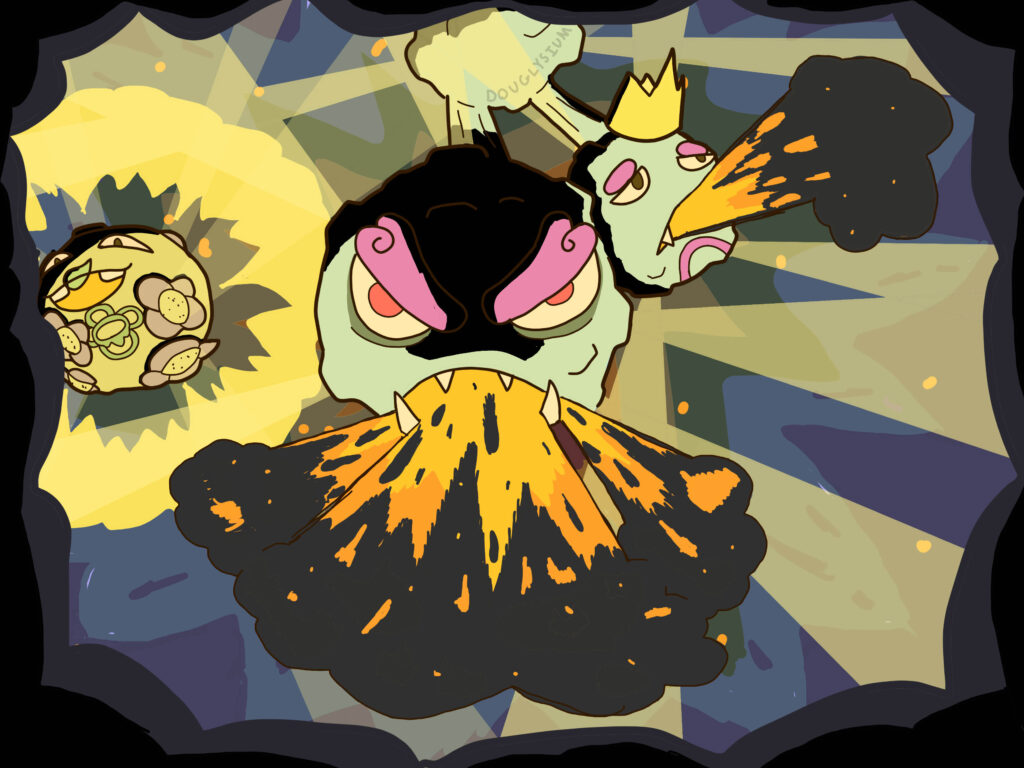 12: A version of the second drawing (2) in which the shadows on Koffing and Pipebomb are rendered partially transparent while both them and the smoke in the foreground is tinted orange from the light of Koffing and Weezing’s explosion and light.