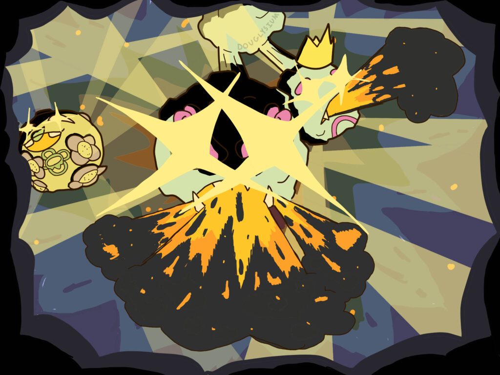2: A version of the last drawing (1), but both Pipebomb and Koffing have a yellowish-orange tint from the light of the explosion.