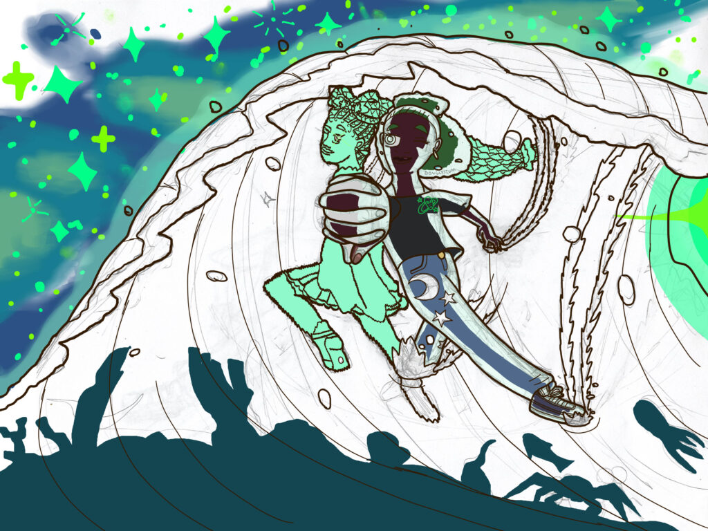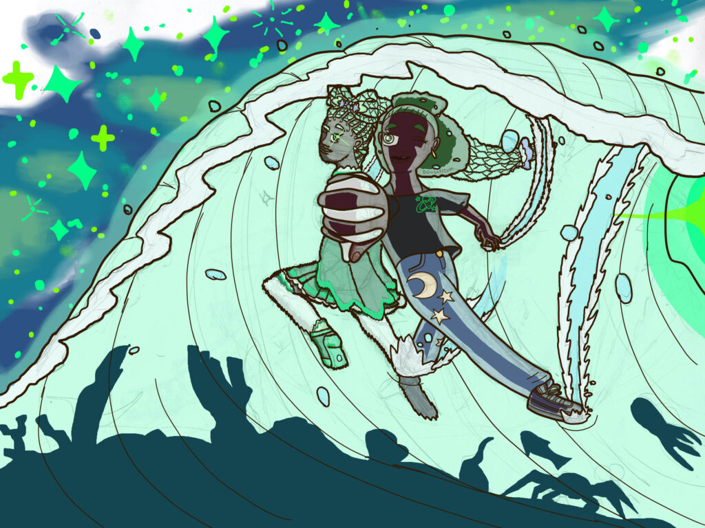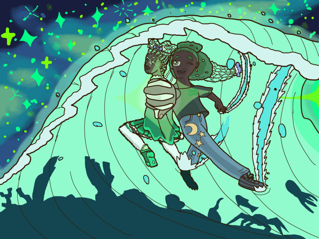 1: A digital drawing of inksphynx’s magical girl oc Anemone Zephyr. She is a Black girl with green hair that has it tied back into two buns, one on the back of her head and a much smaller one above that on top of her head. Anemone is wearing a gray shirt with a small alien icon over her heart and blue jeans that have a yellow moon and stars on them with gray shows. She is skating across the water with her left foot going beneath the water’s surface as a wave of glowing water rushes over her. Instead of a normal reflection on the water’s surface there is instead Anemone’s magical girl form with brighter green hair tied into braids with glowing green eyes. Her magical uniform has white gloves, a green top with a white collar and green skirt, along with white stockings that have green highlights and green high heels. The reflection reaches out through the surface of the water to lock hands with Anemone. The night sky is full of green stars and green nebulas of varying shades. Beneath the wave some ocean creatures and environments can be seen. A strange green glow shines from the right side of the wave just off screen. Below the waves a silhouette of some sea creatures and terrain under the water can be seen.