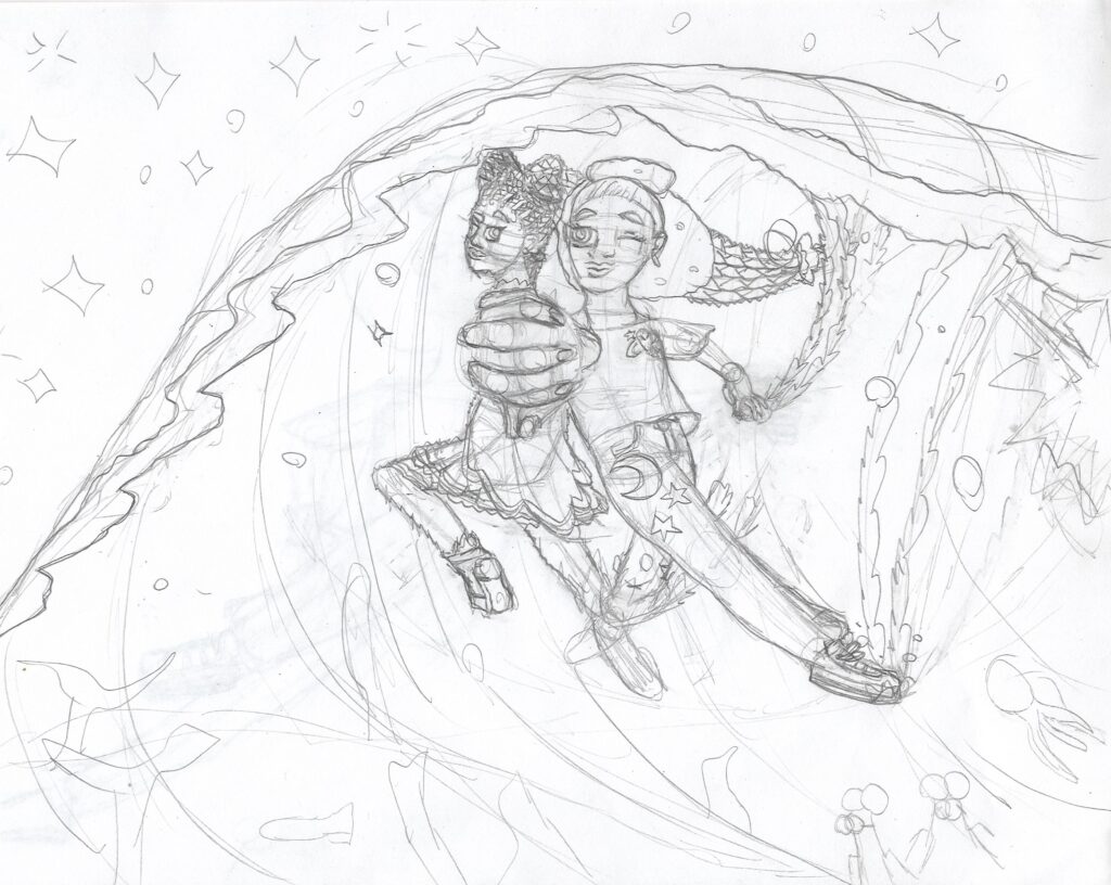 8: A version of the 1st image (1) in which the colors of the wave, the parts of the sky that aren’t stars or nebulae, and Anemone and her reflection (outside of the shadows and some highlights, have been removed. Revealing the original paper sketch of the drawing below.