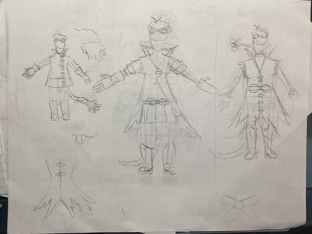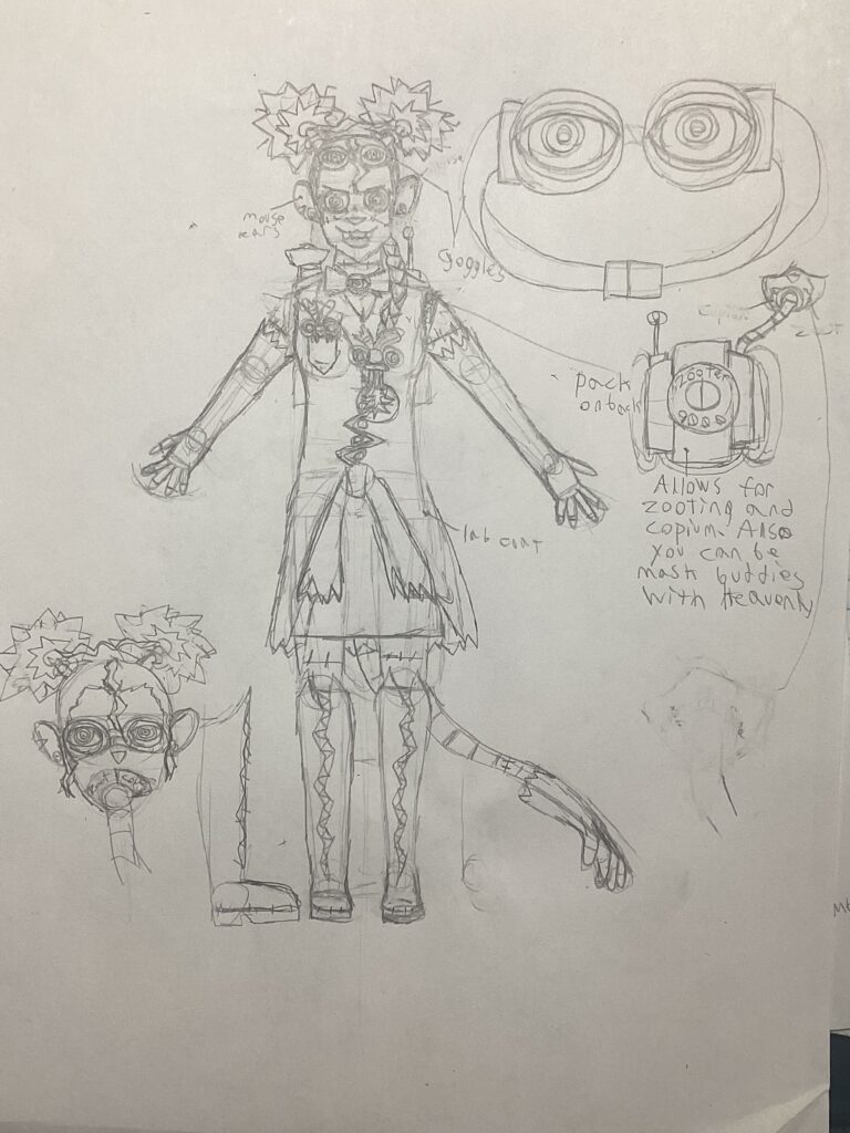 1: A design of the Vtuber Mich Mochievee as a mad scientist. In the design she has spiky hair tied into two spiky pony tails bound by some device crackling with lightning. Large and round cartoonish eyes with red rings around their red iris and pupils, goggles that look like red eyes, a sleeveless long collared shirt that is purple on the Michi’s right side and black on her left with a lightning pattern bisecting the shirt down the middle. She has gloves that go up to her upper arm, an office skirt with a lab coat wrapped around her waist. He has thigh high boots and the tail of a rat. Said tail has a limp glove worn half haphazardly on its end. The boots have a sipper design meant to resemble a lightning bolt