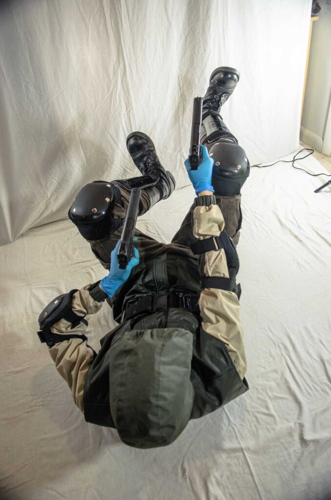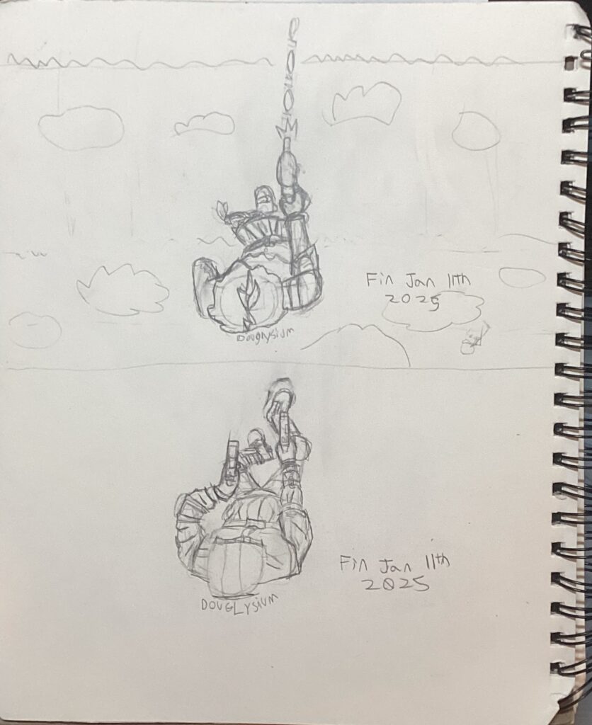 1: A page in a sketchbook broken into two halves. The bottom half is a man falling backwards as he holds two guns up. The top of his head is facing the viewer and covered by a hood. The top image is my OC Adam Rosa in the same pose, an effeminate Black man in a skirt. Adam is missing his left arm, however, so he has only one gun and it resembles something more akin to a water gun firing round projectiles or drops. Both drawings are done just in pencil.