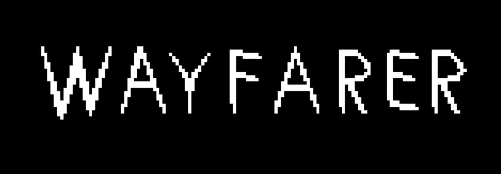 2: The word “WAYFARER” written out in pixel art. Each letter looks sharp. The letters here are white.